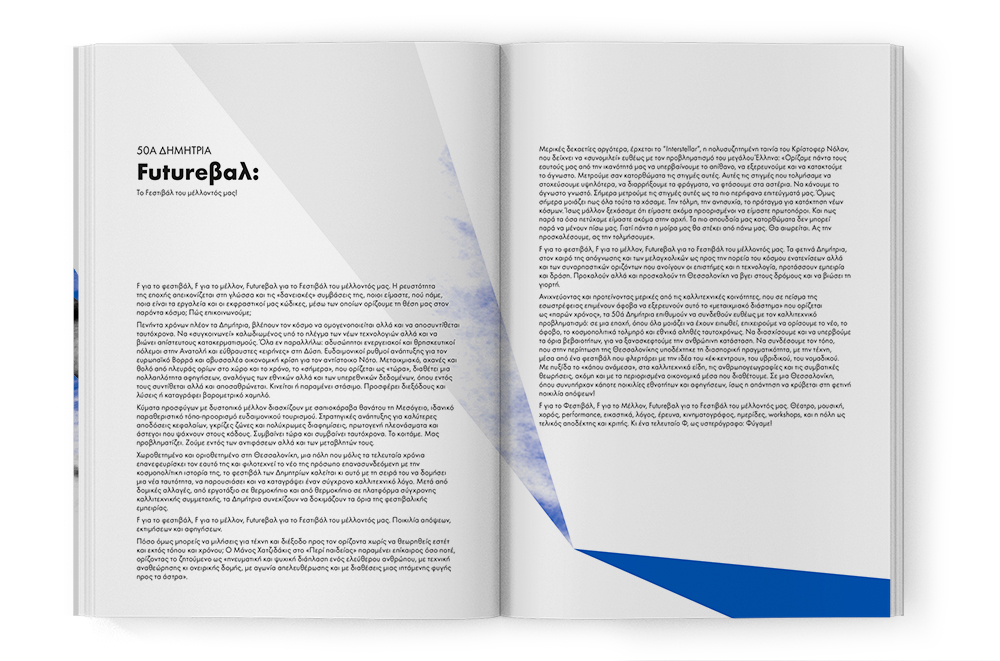 Το brief ζητούσε μια print επικοινωνία που θα μετέφερε την αίσθηση του ανανέωσης, του reboot, της αναγέννησης ίσως και της καταστροφής που θα οδηγήσει στο μέλλον. Η Pad χρησιμοποιεί ένα υπερηχογράφημα εγκυμοσύνης ως σημείο αφετηρίας και δημιουργεί ένα σύμβολο που βρίσκει τη θέση του στην outdoor και online επικοινωνία, στις εκδόσεις και στα αναμνηστικά αντικείμενα της διοργάνωσης, αντανακλώντας την ιδέα της κυοφορίας του νέου, της δημιουργίας, της καινούργιας εικόνας που ετοιμάζεται να ξεδιπλωθεί.