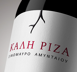 Για το Ξινόμαυρο Αμυνταίου Καλή Ρίζα, ο χώρος της ετικέτας αντιμετωπίζεται ως η αόρατη περιοχή, το χώμα κάτω απ’ το όποιο αναπμτύσσεται το κλήμα. Έτσι, η άνω γραμμή κοπής γίνεται το σημείο ένθεσης του συμβόλου, που με μέθοδο UV τονίζεται, ώστε να υπογραμμίσει το χαρακτήρα του προϊόντος: ένα εκλεκτό κρασί από καλή ρίζα.