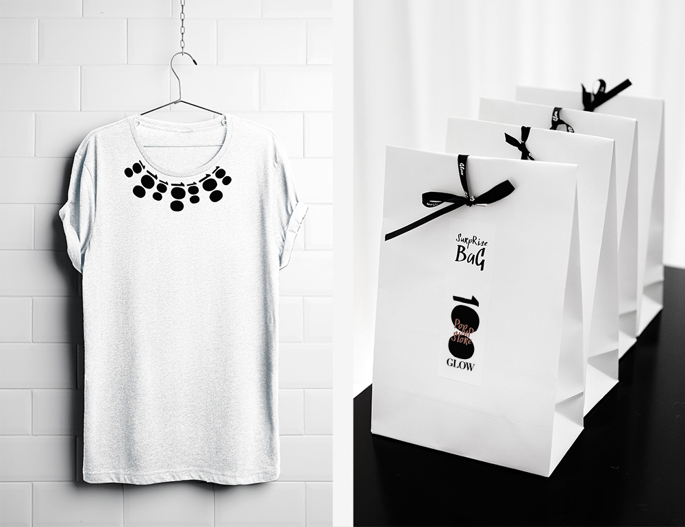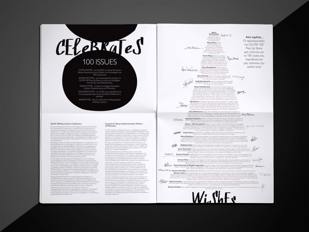 Για την επέτειο των 100 τευχών του, το περιοδικό Glow γιόρτασε το γεγονός με τη δημιουργία και τη λειτουργία ενός pop-up concept store. Στο πλαίσιο του σχεδιασμού της οπτικής ταυτότητας του Glow 100 Pop Up Store, η Pad μετατρέπει τον αριθμό 100 σε εικόνα και σύμβολο με πλατφόρμα μια street ασπρόμαυρη αισθητική, η οποία δανείζεται από τους κώδικες του tagging για να αποδώσει τον εφήμερο χαρακτήρα του event, αλλά κι από τη φιλοσοφία του ως οπτικού ιδιώματος, που αναπτύσσεται στο δημόσιο χώρο, για να υπογραμμίσει τον ανοιχτό διάλογο και τη συλλογικότητα.