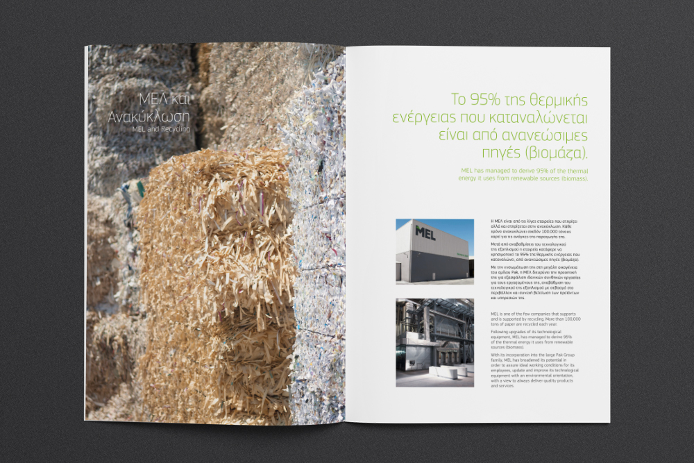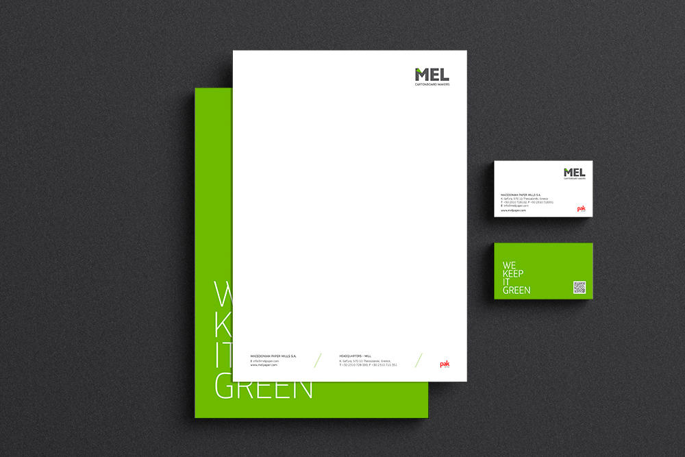 Η ΜΑΚΕΔΟΝΙΚΗ ΕΤΑΙΡΕΙΑ ΧΑΡΤΟΥ Α.Ε. είναι η μοναδική βιομηχανία ανακυκλωμένου χαρτονιού στην Ελλάδα. Η έμπρακτη αφοσίωση της ΜΕΛ Α.Ε. στην πράσινη οικονομία εδώ και πενήντα χρόνια, αποτέλεσε πραγματική έμπνευση για την Pad, που κλήθηκε να δημιουργήσει την εταιρική ταυτότητά της, δίνοντας της νέο σύγχρονο πρόσωπο. Ξεκινώντας από τον λογότυπο και το μήνυμα WE KEEP IT GREEN και φτάνοντας ως την παραμικρή εφαρμογή, η πρόταση αποτυπώνει, μέσω στιβαρής τυπογραφίας, τη μακρά διαδρομή του πελάτη και υπογραμμίζει την "πράσινη" πλευρά του, μέσα από τη χρήση διαφορετικών ποιοτήτων και υφών ανακυκλωμένου χαρτονιού.